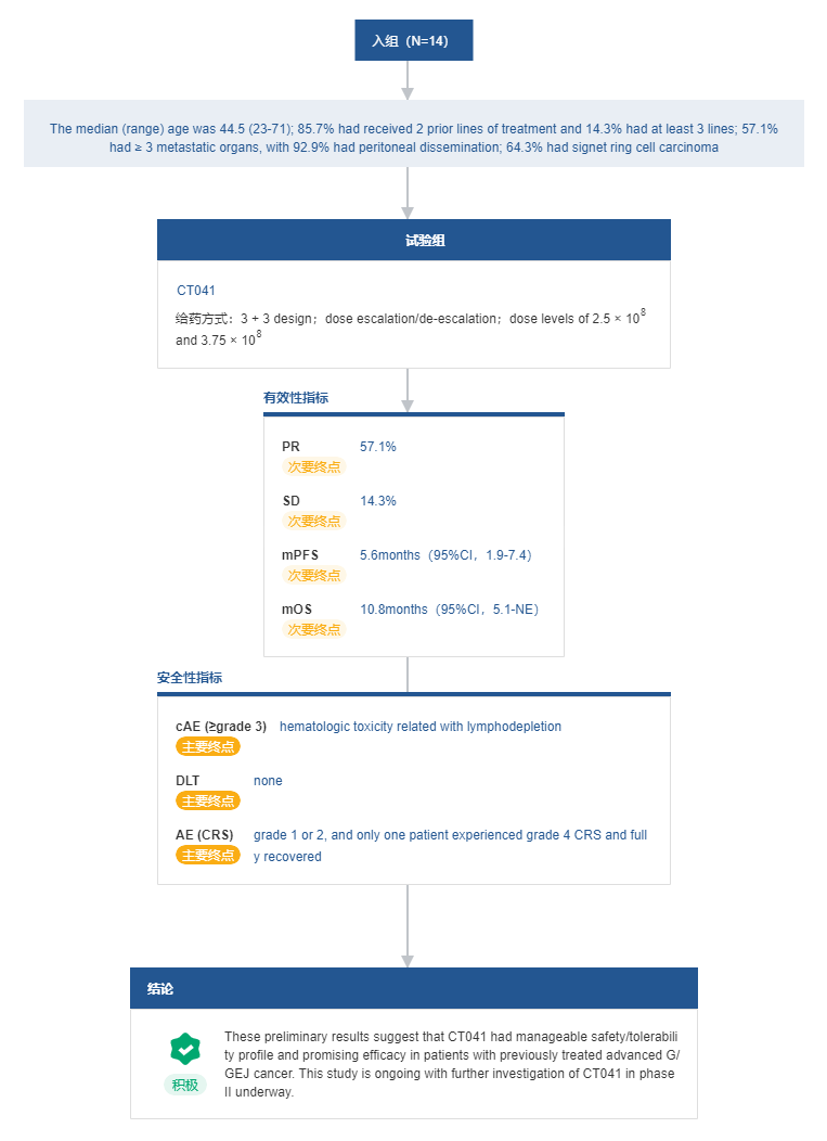 在 2022 ASCO 中,科济公布了两项临床试验结果。其中针对晚期胃癌/食管胃结合部腺癌的 Ib/II 期研究(NCT04581473)最新 Ib 期数据显示,截至 2021 年 12 月 22 日,14 例患者中有 8 例(57.1%)在 CT041 首次输注后的首次肿瘤评估即达到部分缓解,基于研究者评估 ORR 和 DCR 分别为 57.1% 和 78.6%。中位随访时间为 8.8 个月, mPFS 和中位总生存期(mOS)分别为 5.6 个月和 10.8 个月。至数据截止日期,有 7 例患者仍然存活。基于此,科济将推进进一步的 II 期试验。