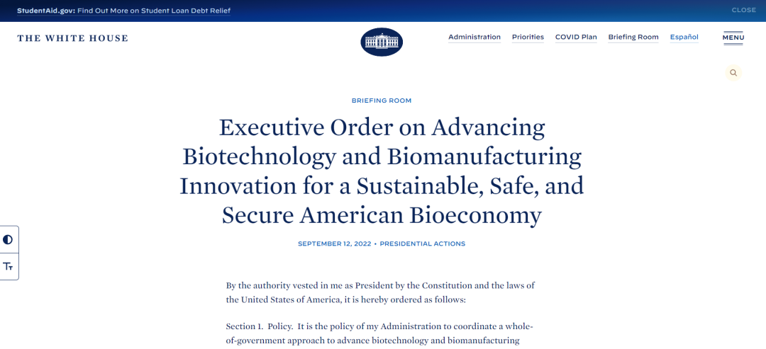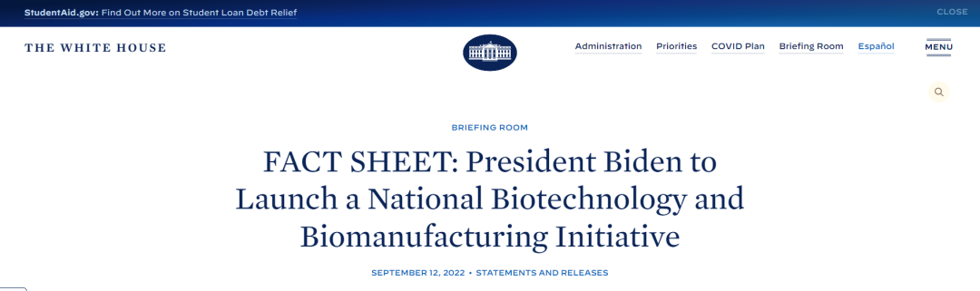 2022 年 9 月 12 日,白宫官网发布简报,宣布了美国总统拜登已经正式签署了一项行政命令,以启动一项 “国家生物技术和生物制造计划”(National Biotechnology and Biomanufacturing Initiative)。
