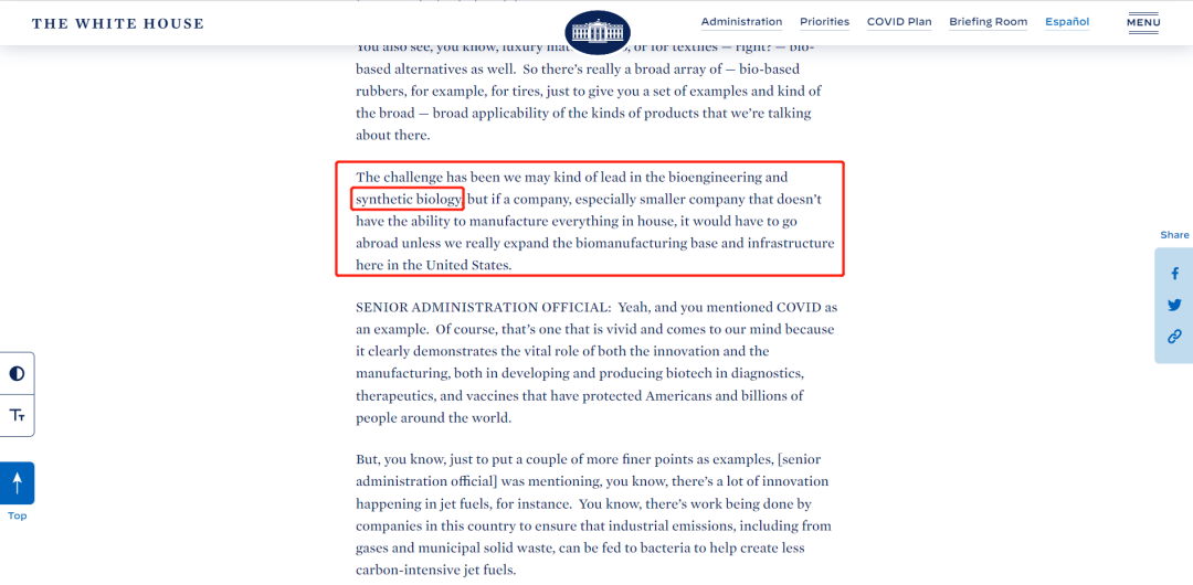 很显然,此项计划所针对的核心,直指合成生物学及其下游制造。而在稍早时候,在周日的电话会议上,美国高级官员因面对提问而解释该计划时,更是直接这样说道: