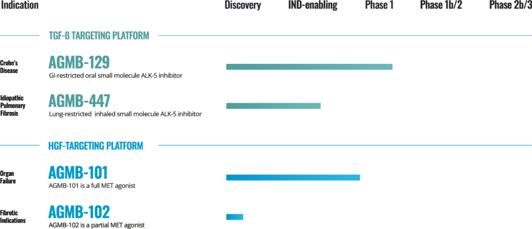 该公司今年完成1.14亿美元B轮融资,并且与辉瑞达成合作,共同研发AGMB-129。AGMB-129之外,该公司的用于治疗特发性肺纤维化的AGMB-447(一种吸入式ALK-5小分子抑制剂)正处于IND申报阶段。Agomab公司也有两款针对MET受体的在研激动剂,包括用于治疗器官衰竭的AGMB-101和针对多种纤维化适应症的AGMB-102,目前AGMB-101已进入IND申报阶段。
