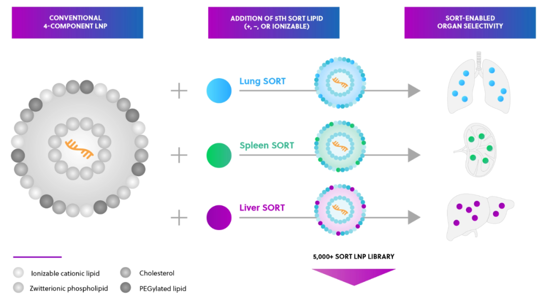 ReCode公司的独特之处在于其器官选择性脂质纳米颗粒靶向递送系统。它通过在配方中加入具有不同生化特征的脂质,帮助身体将LNPs递送到靶标器官,包括肺、脾脏等等,并且具有不被肝脏吸收的能力。