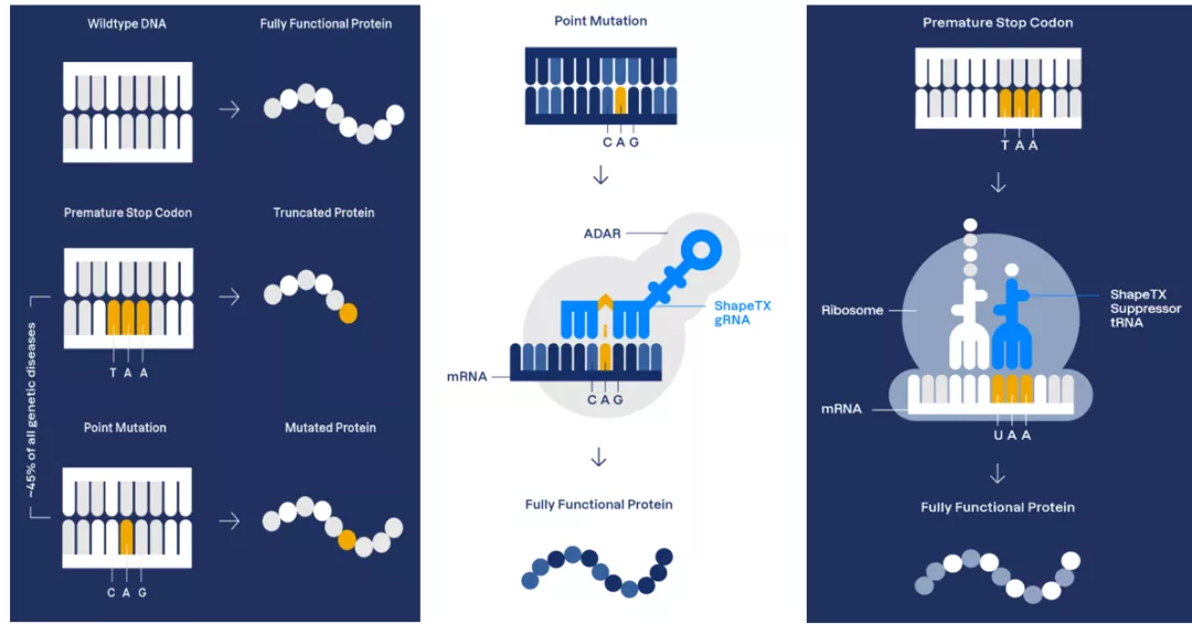 ▲Shape公司的RNAfix平台通过指导RNA募集ADAR,完成A到G的编辑修改,RNAskip平台通过tRNA让蛋白合成不受过早出现的终止密码子影响(图片来源:Shape公司官网)