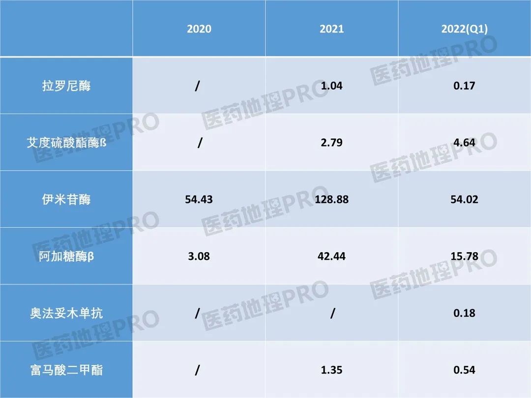 初审名单中部分罕见病药物整体医药市场销售金额(单位:百万元)