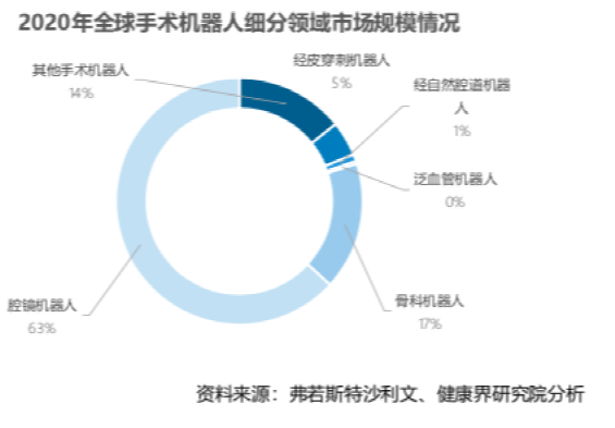 以达芬奇机器人为代表的腔镜手术机器人,是商业化最成功、技术最成熟的手术机器人,骨科手术机器人则次之。手术机器人的市场规模,仅腔镜和骨科和两个细分领域就占据了80%左右。