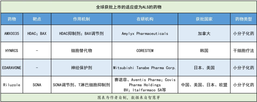 目前,全球获批上市的适应症为ALS的药物有四款,其中FDA获批的有2款为EDARAVONE和Riluzole。