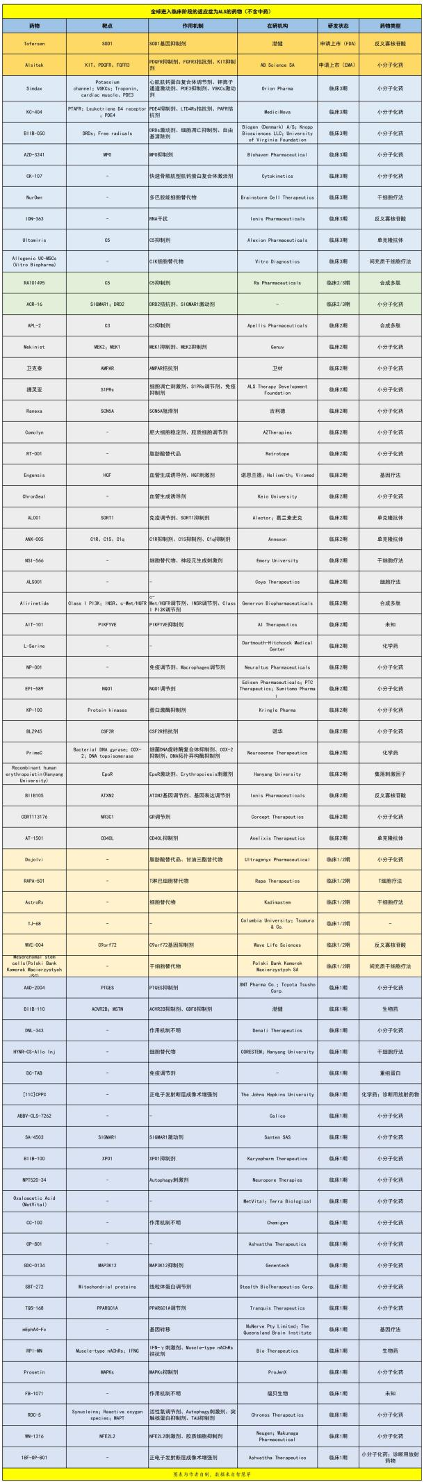 从以上图表中,我们可以看出,ALS领域的药物研发具有较大的差异化,药物类型非常丰富,有小分子化药、生物药、干细胞疗法、细胞疗法、基因疗法、反义寡核苷酸、单克隆抗体、合成多肽、化学药等。