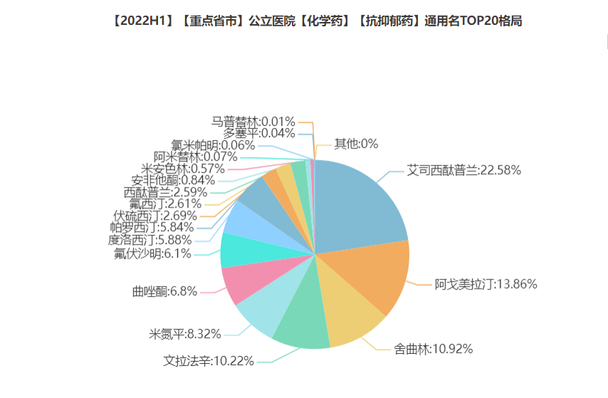 2022年上半年【抗抑郁药】国内样本医院TOP20榜单,排名前五分别是:分别是:艾司西酞普兰、阿戈美拉汀、舍曲林、文拉法辛和米氮平。其中,SSRI/SNRI抑制剂占据了前五名中的3个席位,分别是:艾司西酞普兰(1)、舍曲林(3)、文拉法辛(4)、舍曲林;阿戈美拉汀上升至第2位,米氮平首次冲进TOP5。而昔日TOP5常客度洛西汀掉队了。