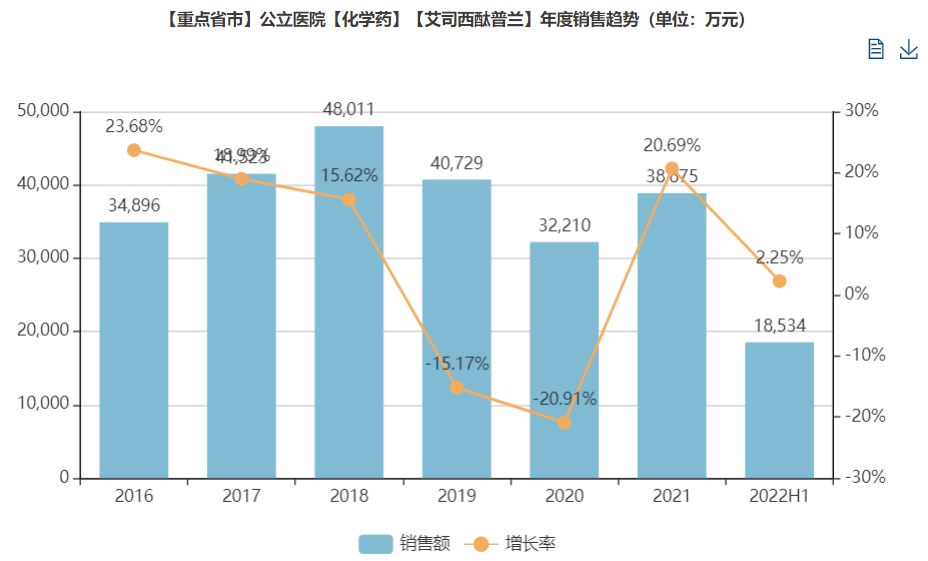 从我国样本医院终端销售情况看,艾司西酞普兰除2019年、2020年分别受4+7集采及新冠疫情影响,销售额有所回落,2021年又重现强劲的增长势头,全年销售收入3.89亿元,同比增长20.69%。2022年保持稳定增长,H1销售额达1.85亿元。