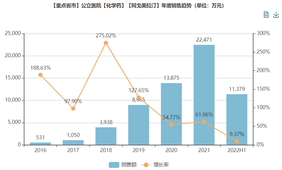 阿戈美拉汀近年披荆斩棘、节节攀升,逐渐超过舍曲林等抗抑郁大品种,在2020年样本医院抗抑郁药排行榜还位于第五,2021年就进入前三,2022年H1已经上升至第二位。