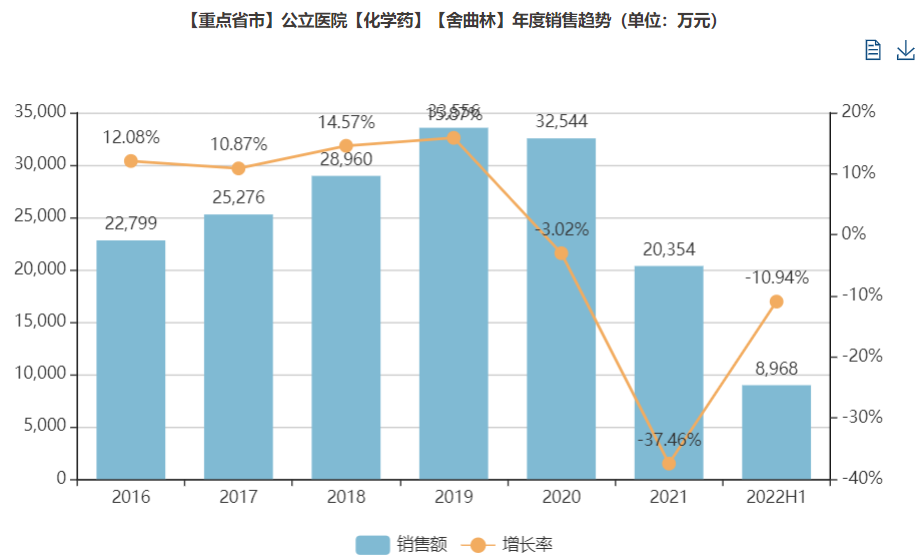 从中国样本医院终端数据看,舍曲林的销售额从2.28亿元(2016年)逐年扩容至3.36亿元(2019年)。不过,舍曲林被纳入第三批集采后,销售额快速下滑,2021年仅为2亿左右,2022年H1继续下滑,目前销售额不超1亿,仅为8968万元,同比下降10.94%。