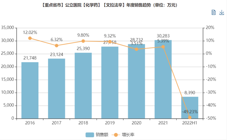 近年来,中国重点省市公立医院【文拉法辛】的年均销售增速平稳,至2021年销售额已突破3亿元。但是文拉法辛在去年进入了第五批集采,2022年销售额骤降,H1仅为8968万元,同比下降49.23%,排名也从去年的第二滑落至第四。