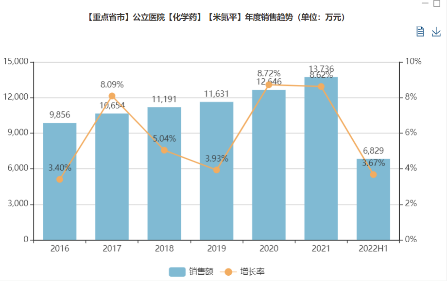 米氮平也是抗抑郁重磅过亿品种,且增速平稳,从2016年以来常年在榜单排名第六,此次是首次进入TOP5。米内网显示,2022年H1国内重点省市公立医院【米氮平】销售数据为6829万元。原研欧加农占比接近四成(38.53),华裕制药(24.86%)、哈尔滨三联(18.99%)、山西康宝(15.05%)等紧随其后。