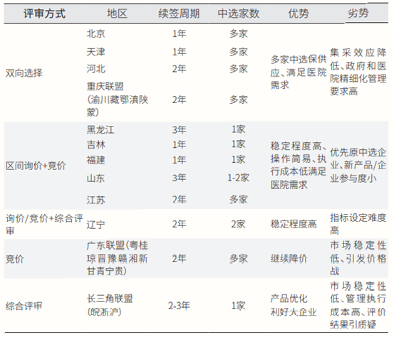 黑龙江、吉林、山东等地采用询价续约模式,按照上一轮中选价格询价成功的可直接续约产品,优先原中选企业,稳定程度最高,执行成本低。北京、天津、河北等地采用双向选择评审方式,特点为多家中选,满足保供应需求,稳定程度次之;但集采效应降低,对政府和医院的精细化管理要求高。综合评分以长三角联盟为代表,产品优化,利好大企业,但市场稳定性较低,评价结果引质疑。而完全竞价则以此次开展续约的广东联盟为代表,优势是多家中选,继续降价,缺点是市场稳定性最低,容易引发价格战。