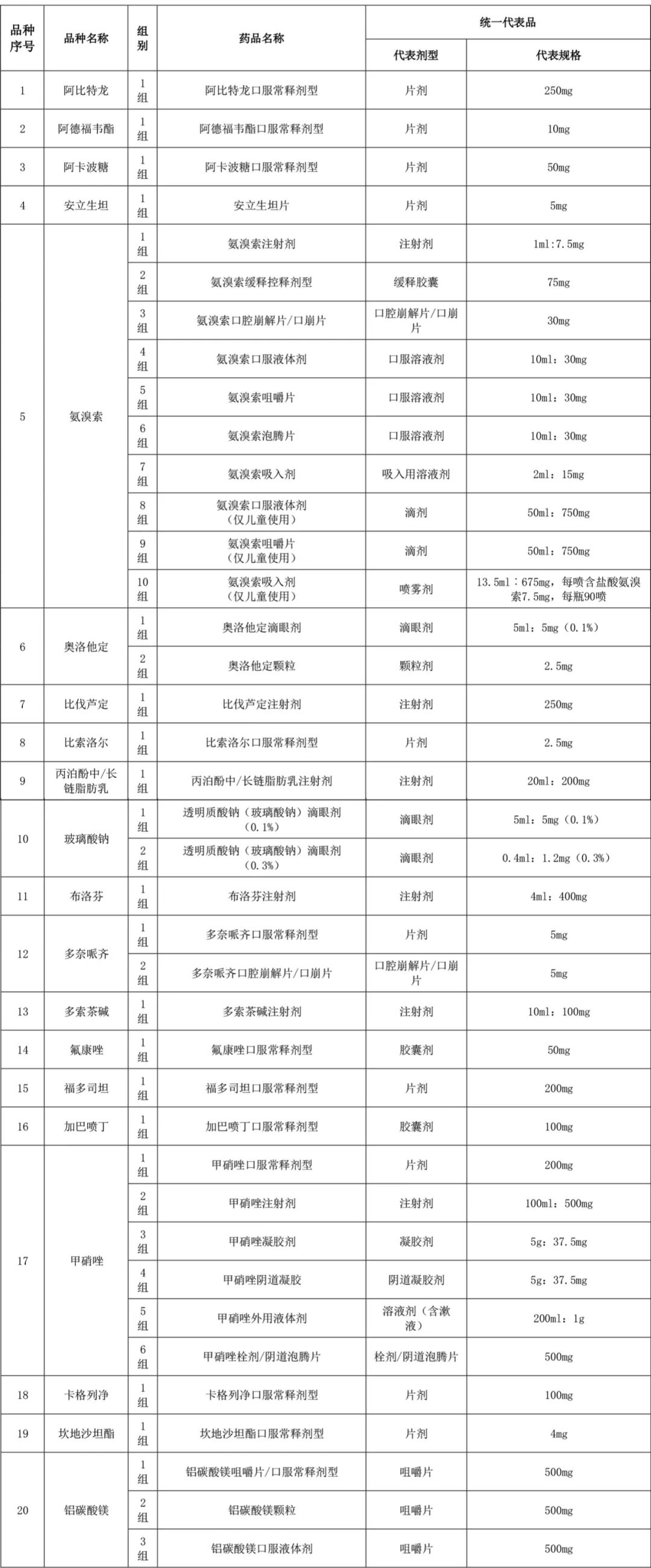 不难看出,广东省集采续约在延续前期国采的基础上,又进行了采购品规扩大。例如祛痰剂氨溴索,第四批国采中仅纳入2ml:15mg和4ml:30mg两个注射剂规格,而在此次采购清单中,氨溴索共分为10组,纳入了注射剂、缓释胶囊、片剂、溶液剂和滴剂等多种剂型,并且纳入的注射剂规格为1ml:7.5mg,非原来的国采规格,或与临床实际应用特点相结合。