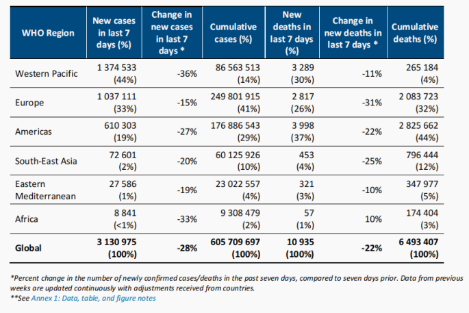 分区域而言,WHO的6个区域报告的每周新增病例数都有所下降,而6个区域中的5个区域的每周新死亡人数下降:欧洲区域(-31%)、东南亚区域(-25%)、美洲区域(-22%)、西太平洋区域(-11%)、东地中海区域(-10%),但值得注意的是,非洲区域死亡人数在上升(+10%)。
