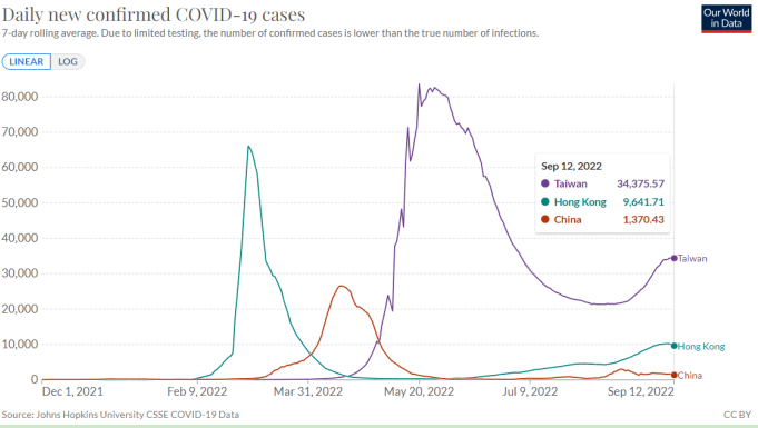 中国大陆、中国香港及中国台湾近日的新增确诊人数(七日滚动平均值) 图源自Our World in Data