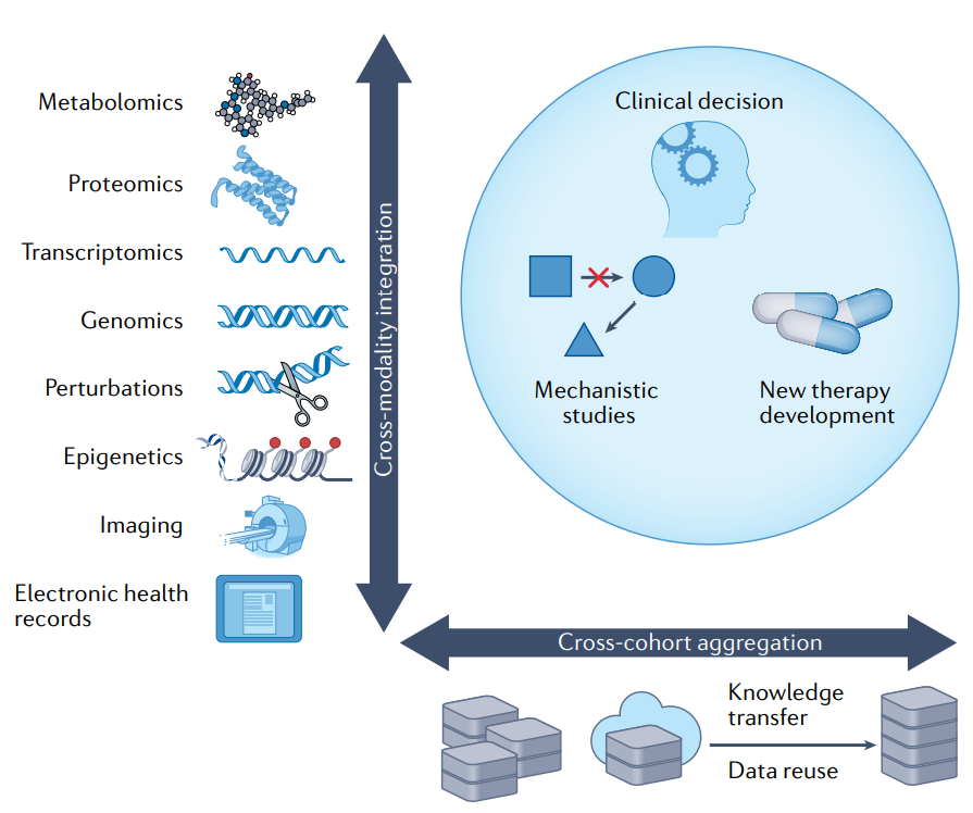 癌症研究中有五种基本数据类型:分子组学数据、扰动表型数据、分子相互作用数据、成像数据和文本数据。分子组学数据描述细胞系统和组织样本中分子的丰度或状态。这些数据是癌症研究中从患者或临床前样本中产生的最丰富的类型,包括关于DNA突变(基因组学)、染色质或DNA状态(表观基因组学)、蛋白质丰度(蛋白质组学)、转录物丰度(转录组学)和代谢物丰度的信息。