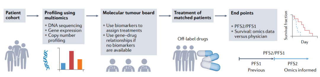 其他类似的试验也已经证明,基于全基因组基因组学或转录组学数据匹配患者使用靶向治疗的效用。在这些研究中,接受组学数据匹配治疗的入选患者比例从19%到37%,在这些匹配的患者中,约三分之一的患者表现出显著的临床益处。