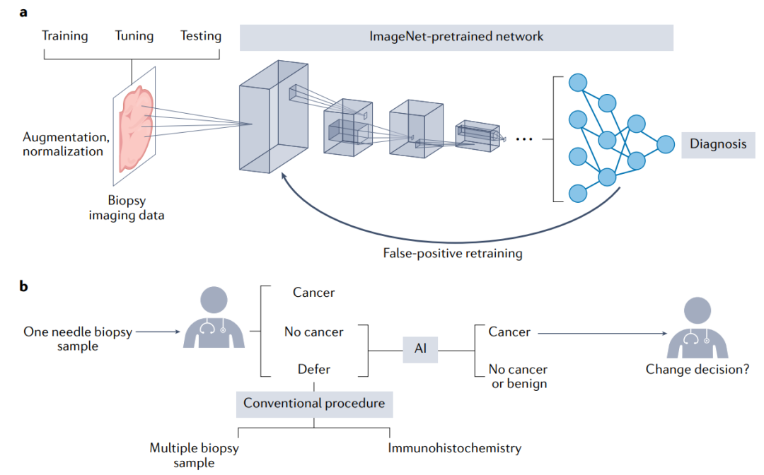 人工智能也开始在分析电子健康记录方面发挥重要作用。除图像和健康记录外,在其他数据类型上训练的人工智能也具有广泛的临床应用,如通过液体活组织检查捕获无细胞DNA或T细胞受体序列进行早期癌症检测,或基于基因组学的癌症风险预测。