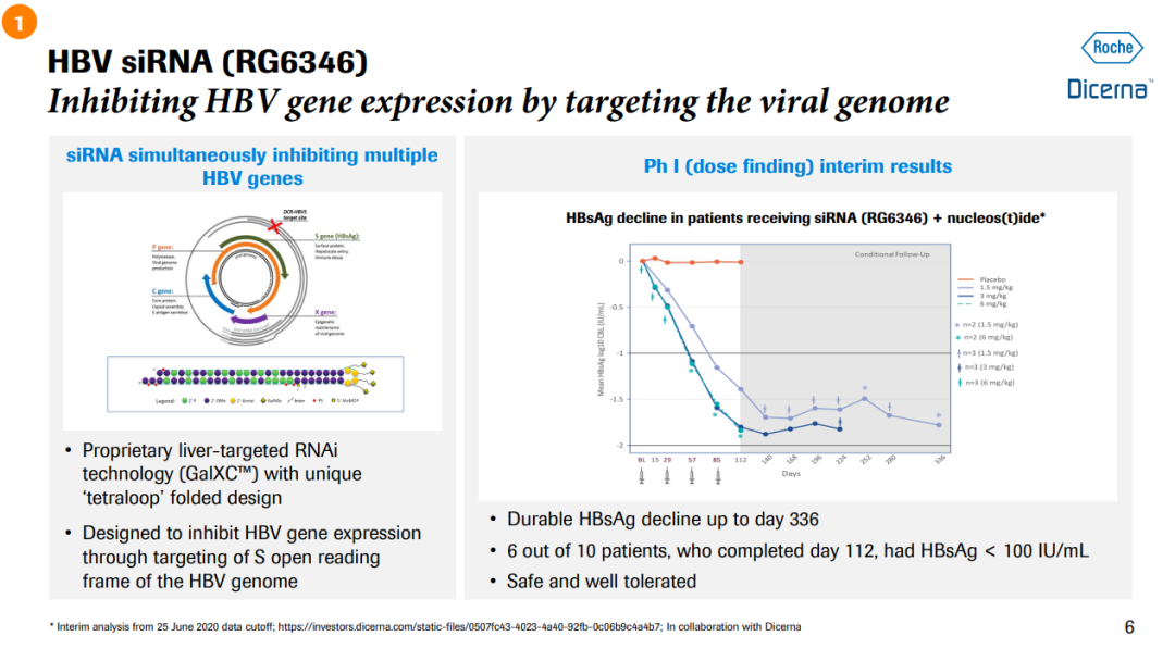 2019 年 ,罗氏与 Dicerna 宣布了一项针对慢性乙型肝炎病毒(HBV)感染的全球许可和研究合作。两者合作的新药项目相对来说开发进展更快。