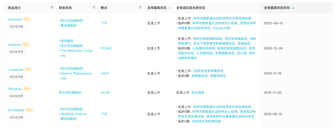 不断有跨国药企加速进军 RNAi 领域,这也带火了该赛道,目前,据 Insight 数据库显示,全球共有 228 款 RNAi 疗法在研,进入临床阶段的有 99 款,其中有 5 款已获批上市,具体如下: