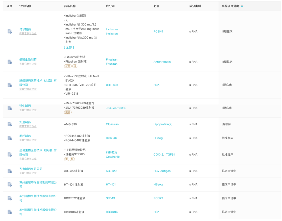 而对于国内企业来说,当前还处于初级阶段,共有 11 款新药进入临床阶段(含申报临床),其中进展最快的进口产品,包括诺华 Inclisiran 以及赛诺菲 Fitusiran,已处于 III 期临床阶段;罗氏、强生、安进等均有布局。