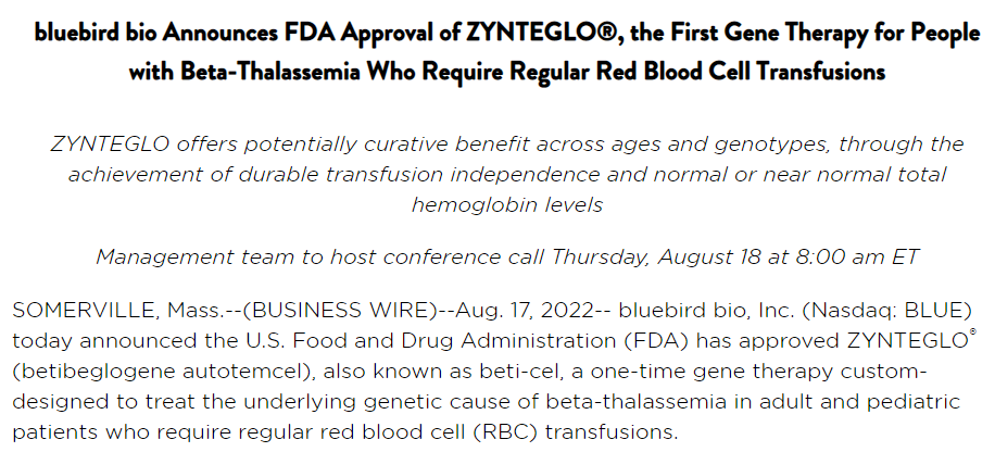 美国时间2022年8月17日,蓝鸟生物(blue bird)宣布FDA批准其基因疗法产品Zynteglo(betibeglogene autotemcel, beti-cel)用于治疗需要定期输血的β-地中海贫血患者,覆盖人群涵盖所有基因型的成人、青少年和儿童。