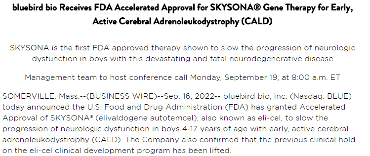 2022年9月16日, 蓝鸟生物官网宣布,FDA已加速批准该公司基因治疗药物Skysona (elivaldogene autotemce,eli-cel)上市,用于减缓4-17岁早期活动性脑肾上腺脑白质营养不良(CALD)男孩神经功能障碍的进展。这是FDA批准的针对CALD患者的首款药物。