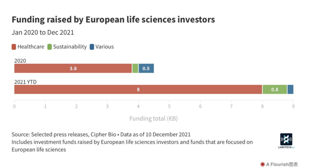 数据显示,流向机构生命科学投资机构的资金不断增加。至2021年底,欧洲生物科技投资者已经获得了90多亿欧元的募资,远远超过了2020年45亿欧元的总额。