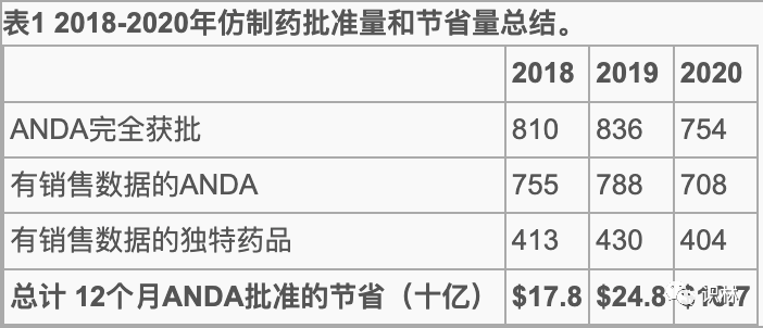 这一节约量的变化部分上与各年份的仿制药完全批准数量有关,2020 年的完全批准 ANDA 数量为 754 件,低于 2019 年的 836 件,以及 2018 年的 810 件(见下表)。