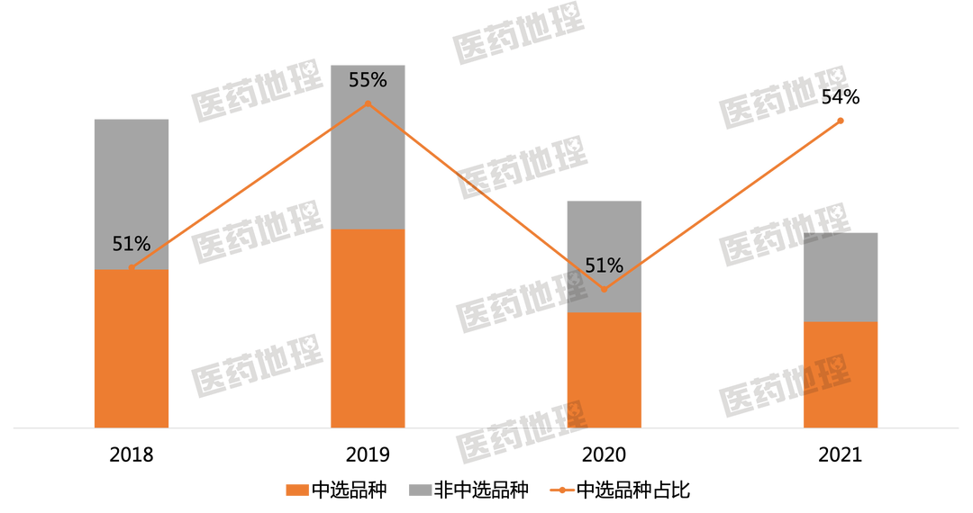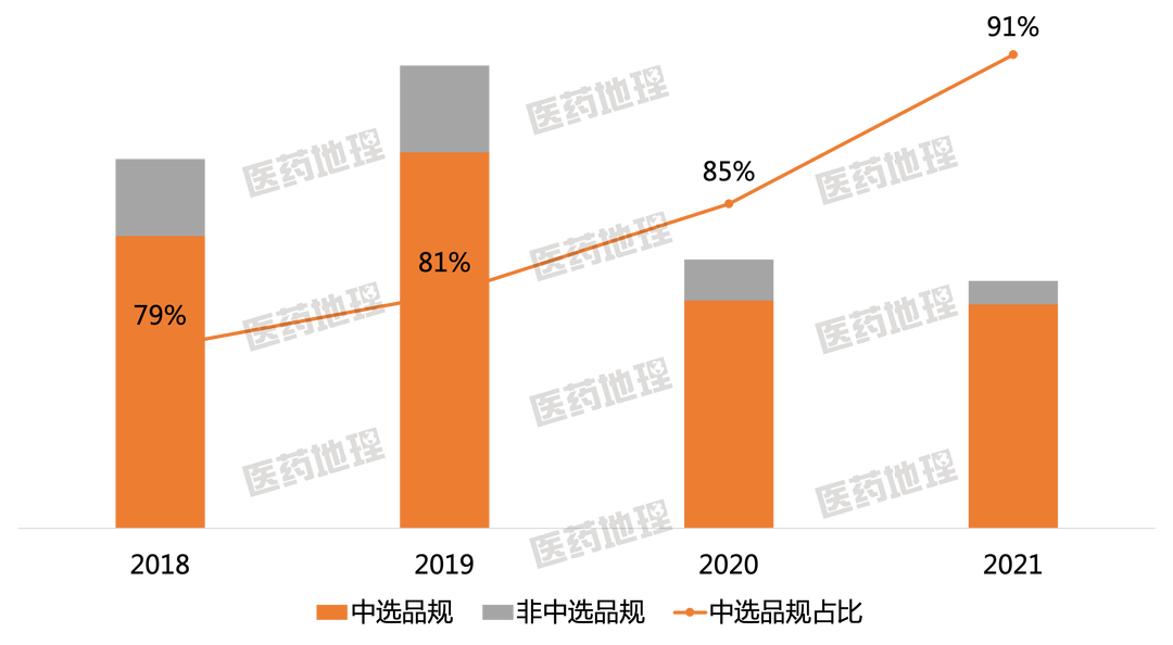 从2018年到2021年,中选产品市场规模稳中有升,占中选品规的比例也由2019年的46%上升到80%,增加了34个百分点,占比差不多翻了一番,由图1所示。中选产品占比之所以涨幅显著,一方面是产品本身的规模增长,另一方面则是因为非中选产品带动整个品规市场大幅缩减。在医药地理《等待非中选产品的是什么?》一文中我们已有分析,2019-2021年非中选产品的复合增长率为-53%,而中选产品的复合增长率为2%,整个中选品规的复合增长率为-23%。