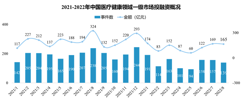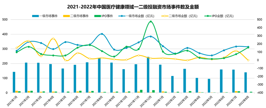 据医药魔方InvestGO数据库统计,截至2022年8月,一级市场投融资趋势较去年节奏放缓,整体趋势较二级市场活跃。中国医疗健康领域一级市场共发生1117起投融资事件,同比去年降低28%。二级市场共发生45起IPO事件,同比去年降低37%,其中,A股、港股和美股分别34起、10起、1起。二级市场再融资事件同比去年降低46%。