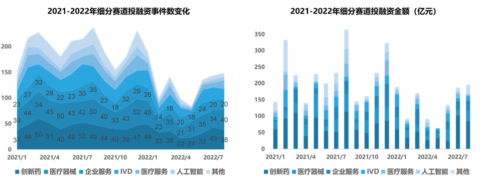 2022年1-8月,中国医疗健康领域IPO事件数和募资金额同比去年呈下降趋势。IPO事件数量由创新药(12起)、医疗器械(10起)领跑,其中创新药、医疗器械和IVD三者IPO数量占比加和达58%。今年6月起IPO事件数量和金额开始出现回升趋势。