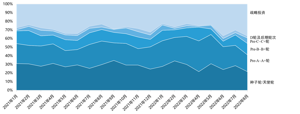投资机构“投早、投小”趋势明显。2021年以来早期轮次事件数量占比超50%,2022年1-8月Pre-A轮~A+轮占比28%,同比去年呈上升趋势。在并不乐观的大背景下,高技术壁垒的高科技项目在资本寒冬中逆流而上,以科技创新、科研转化为主的早期项目将优先受到资本关注。