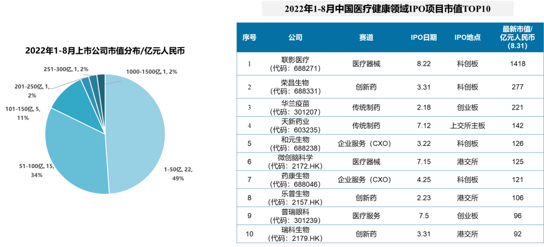今年前8个月,中国医疗健康领域共发生45起IPO事件,市值100亿以下的公司数量占比83%。市值超过百亿的公司共有8家,其中,联影医疗市值达到1418亿人民币,受其上市影响,科创板IPO募资金额在8月份达到今年最高点。
