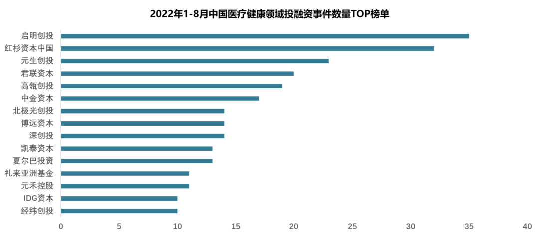 据医药魔方InvestGO数据库统计,2013年-2022年10年间中国医疗健康领域活跃的投资机构数量在2021年(1793家)达到最高,较2013年增长10.7倍。2022年1-8月,中国医疗健康领域投融资数量排名前10的机构共15家,由启明创投和红杉资本中国领跑,这15家机构的事件数量占比中国医疗健康领域总数的22%。