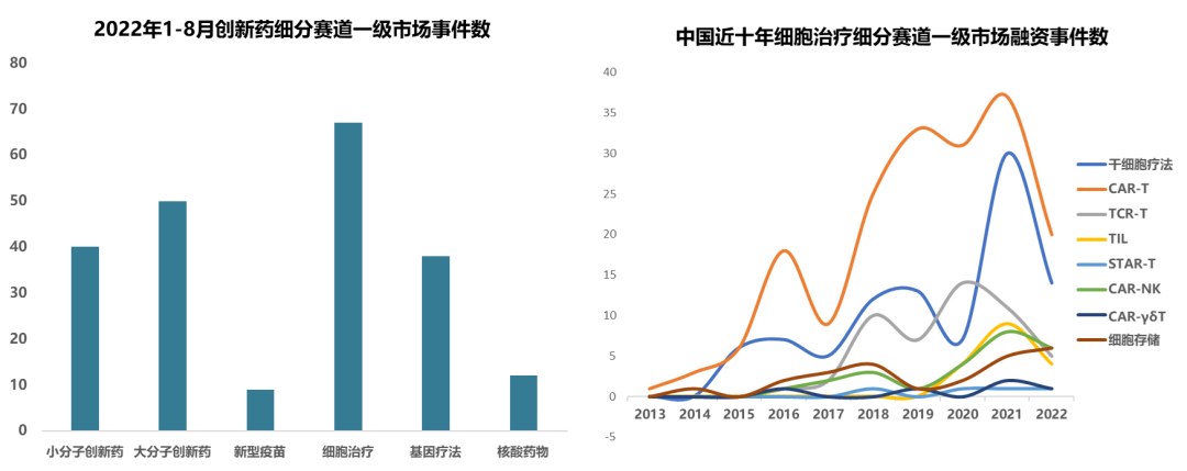 2022年1-8月,细胞治疗一级市场事件数量领跑创新药领域,大分子创新药、基因疗法等紧随其后。2017年,诺华、凯特的两款CAR-T产品获批上市,从此细胞治疗进入新纪元。引发了2017-2018年间细胞治疗投融资事件数量和金额的快速上升。2020-2021年,传奇生物、永泰生物、药明巨诺、亘喜生物、科济药业相继上市。产品开发上,药明巨诺与复星凯特的两款CAR-T产品于2021年在国内获批上市,南京传奇的CAR-T于2022年在美国、欧盟获批上市。进一步激发国内细胞治疗的投资热情。近十年间,CAR-T/UCAR-T的融资事件数量始终领跑细胞治疗行业,干细胞疗法紧随其后。