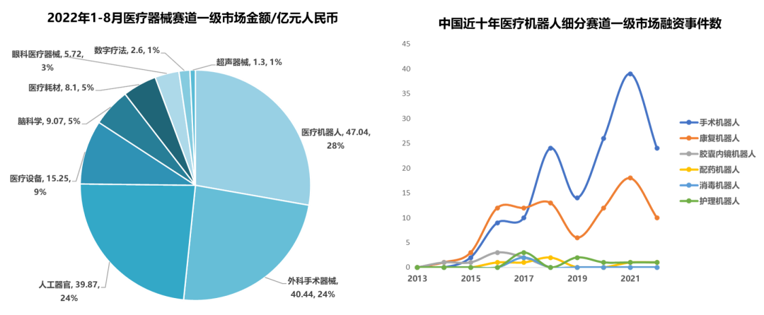 2022年1-8月,外科手术器械、医疗机器人一级市场事件数量领跑医疗器械赛道;医疗机器人一级市场融资金额最高,达28%。医疗机器人在2019-2021年的一级市场投融资事件数量与金额迅速攀升。2013年-2022年期间,手术机器人与康复机器人均在2021年达到一级市场融资事件数量的顶峰。