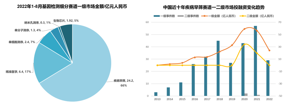 2022年1-8月,疾病早筛的一级市场融资事件数量与金额(占比高达66%)均领跑基因检测赛道。2019-2020年期间,疾病早筛在一二级市场的融资金额都出现明显增长。