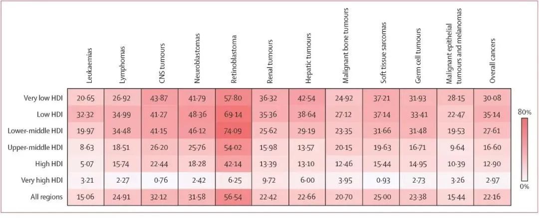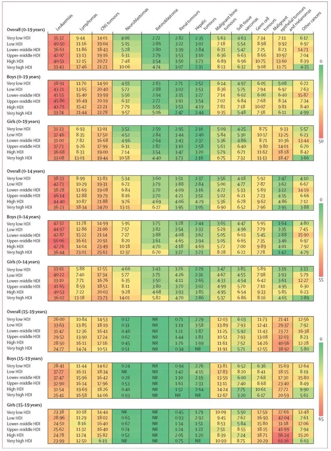 图1. 不同HDI地区儿童和青少年12个癌症主要诊断组的发病率(/百万)