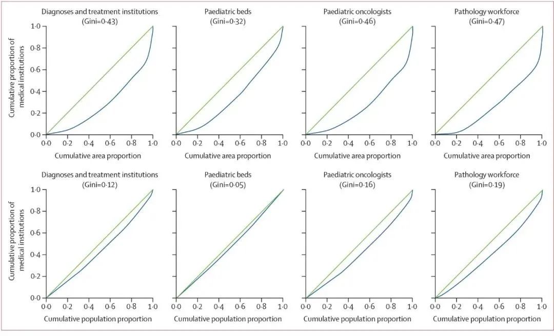 图2. 儿童和青少年癌症相关卫生服务指标地区分布的洛伦兹曲线