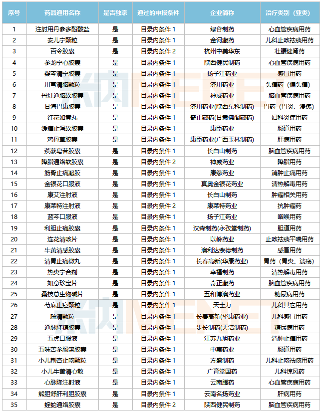 35个通过形式审查的目录内中成药,有31个品种通过目录内条件1入选,另外4个品种通过目录内条件2入选,包含神威药业的降脂通络软胶囊、康莱特药业的康莱特注射液、中美华东的百令胶囊、陕西健民制药的蛭蛇通络胶囊等。