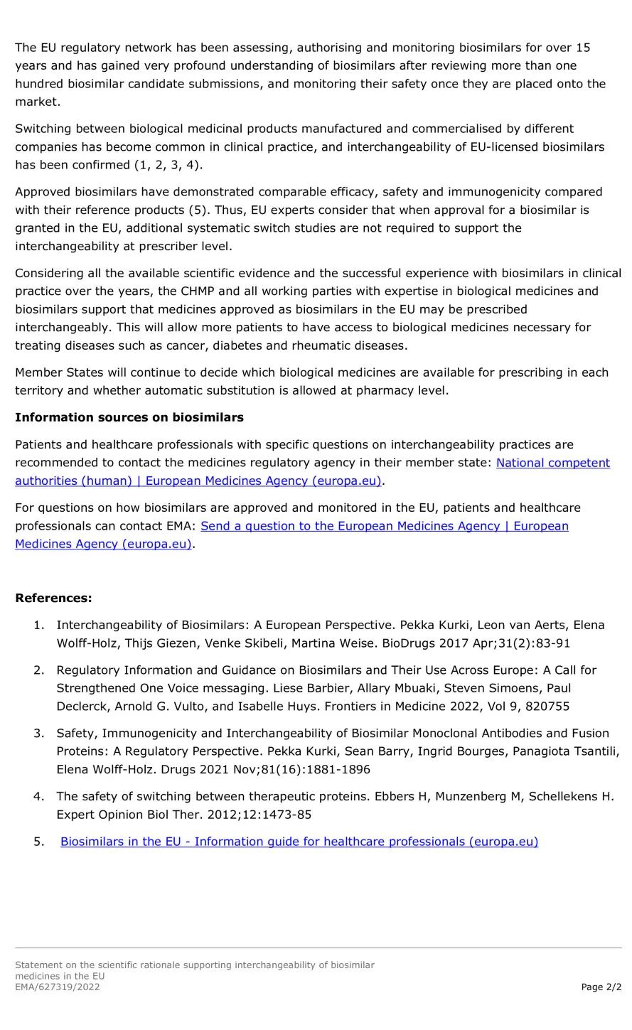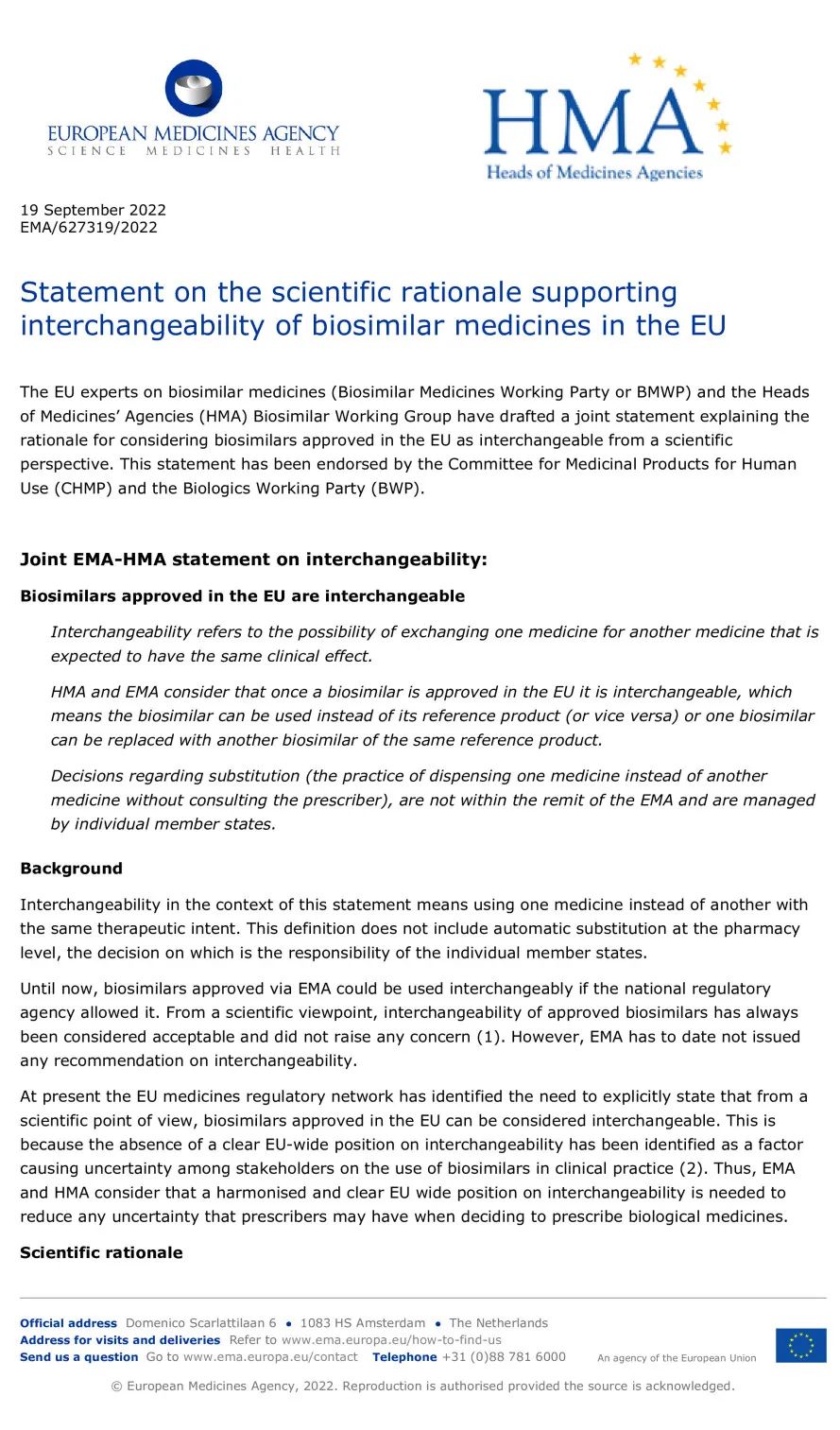 联合声明指出,经欧盟批准的生物类似药是可互换性的,这意味着该生物类似药可以用来代替其参比制剂,或者一种生物类似药可以用同一参比制剂的另一种生物类似药替代。关于药物替代的决定则不在EMA的职权范围内,而是由各个成员国管理。