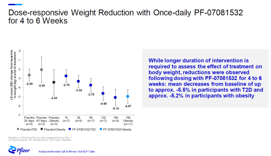 同时,在2型糖尿病和肥胖症患者中,PF-07081532剂量依赖性降低患者的体重。接受最高剂量治疗的患者在接受治疗4-6周后体重平均比基线降低约10斤。