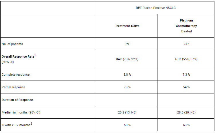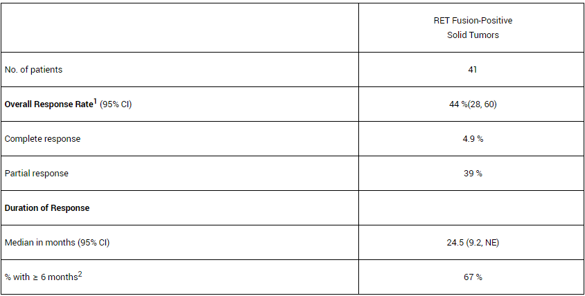 在LIBRETTO-001安全性评估人群(n=796)中,晚期实体瘤患者最常见的不良反应(≥25%)为水肿、腹泻、疲劳、口干、高血压、腹痛、便秘、皮疹、恶心和头痛。最常见的3级或4级实验室异常(≥5%)淋巴细胞减少,丙氨酸氨基转移酶(ALT)升高,天冬氨酸氨基转移酶升高,钠降低,钙降低。