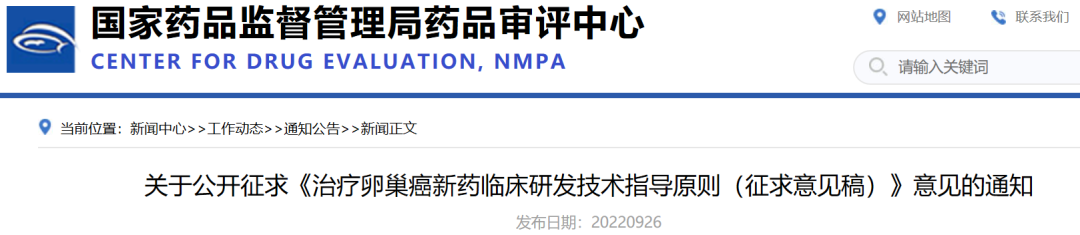 [1]关于公开征求《治疗卵巢癌新药临床研发技术指导原则(征求意见稿)》意见的通知. Retrieved Sep 26, 2022. From https://www.cde.org.cn/main/news/viewInfoCommon/d25d975996ab174eee7d69c8e14e49c9
