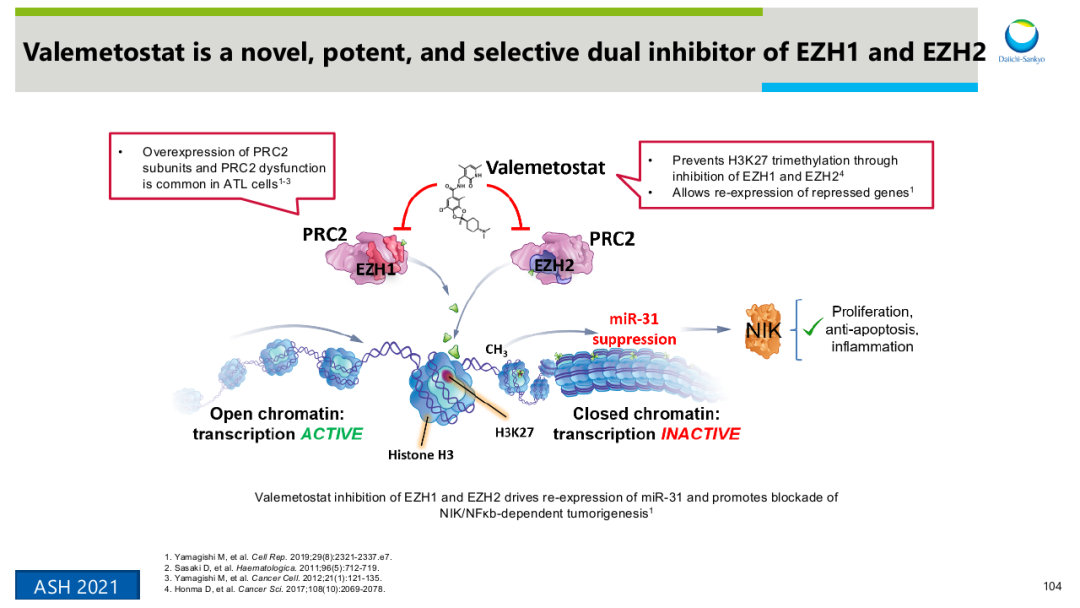 [1] EZHARMIA® Approved in Japan as First Dual EZH1 and EZH2 Inhibitor Therapy for Patients with Adult T-Cell Leukemia/Lymphoma. Retrieved September 27, 2022 from https://www.daiichisankyo.com/files/news/pressrelease/pdf/202209/20220926_E.pdf
