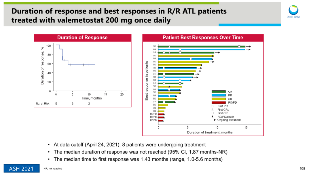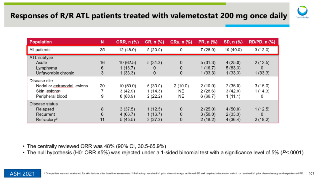 MHLW批准Ezharmia主要是根据VALENTINE-PTCL01全球性关键临床2期试验。此多中心、单臂试验检视了Ezharmia(每天200 mg)作为单药用以治疗之前曾接受CCR4单克隆抗体Poteligeo(mogamulizumab)或其他系统性化疗的复发/难治性ATL患者的疗效与安全性。数据分析显示,在25位患有三种不同亚型的复发/难治性ATL病患中,由独立疗效审评委员会所检验的客观缓解率(ORR)(试验主要终点)达到48%(95% CI:27.8-68.7)。此外,分别在20%与28%的病患中,可见完全缓解(CR,n=5)与部分缓解(PR,n=7)的情形。