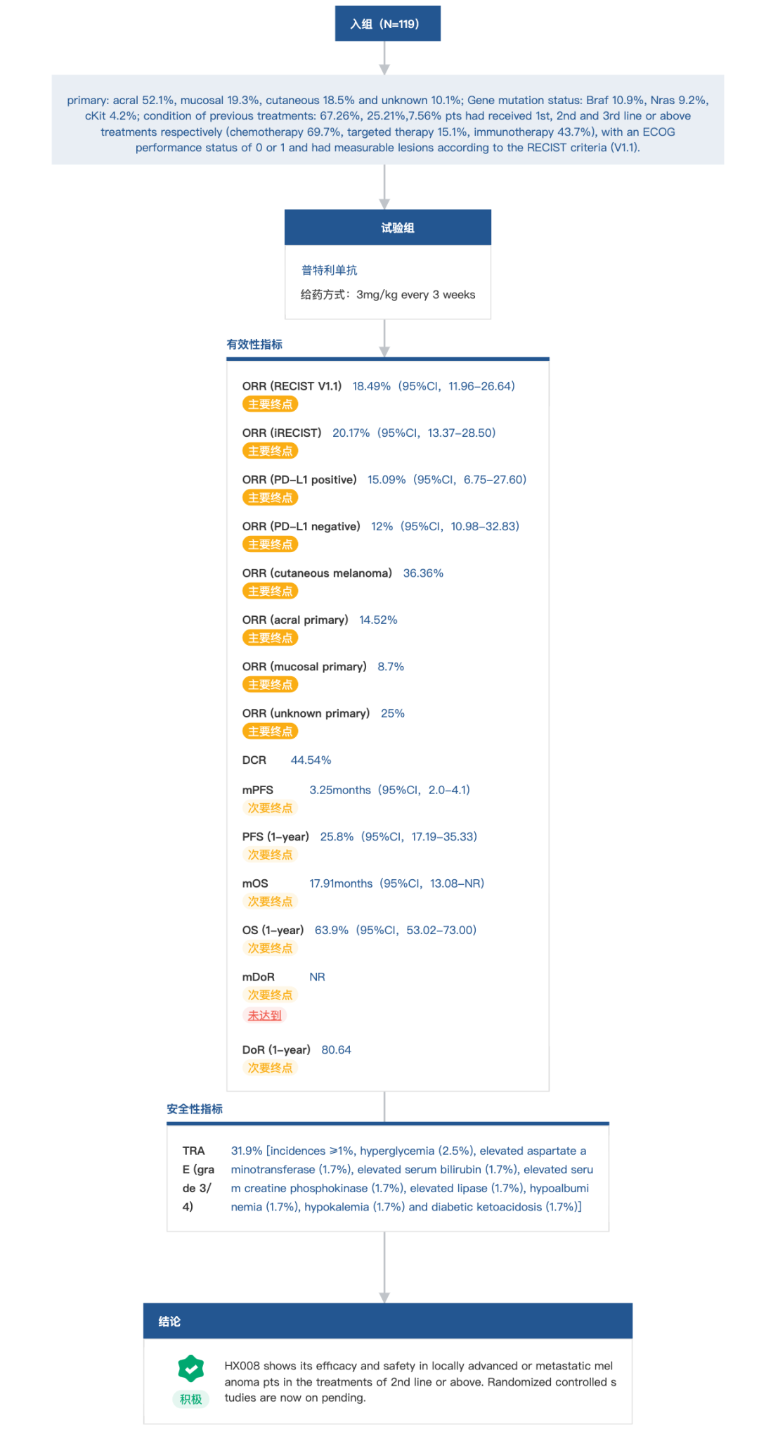 此前,在 2021 ASCO 会上披露的数据显示,HX008 在针对黑色素瘤的 II 期临床试验中 ORR 和 DCR 分别为 18.5% 和 44.5%。