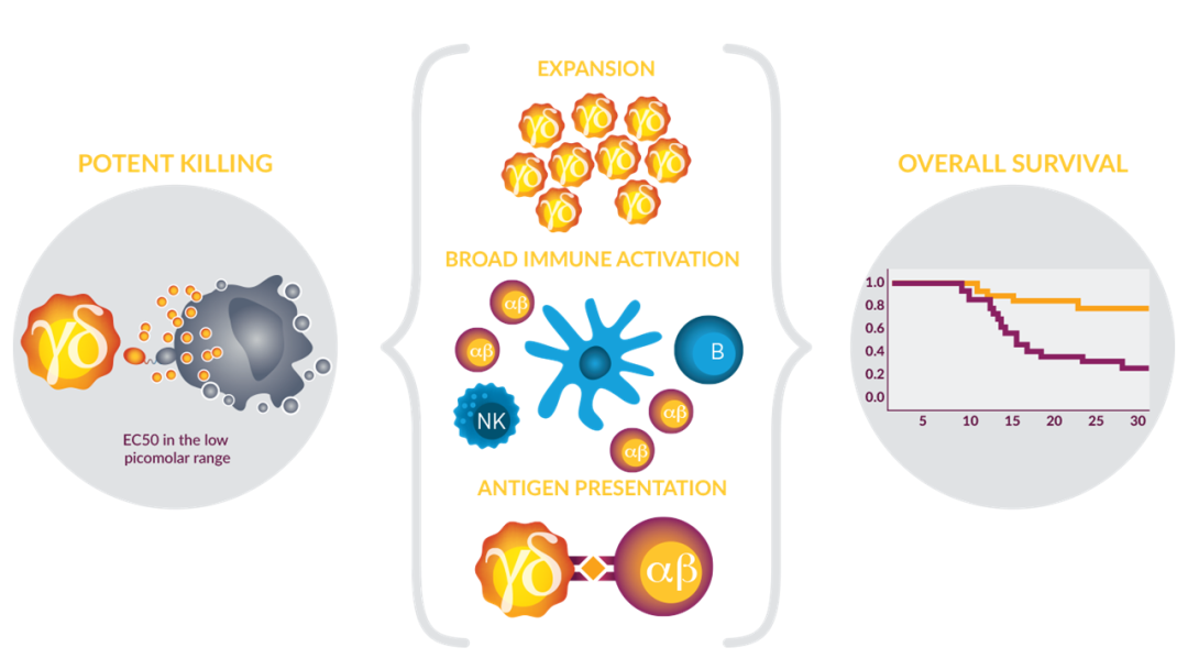 LAVA专有的Gammabody平台是开发靶向Vγ9Vδ2 T细胞与肿瘤相关抗原的现货型双特异性纳米抗体科技。Vγ9Vδ2 T细胞在人体对抗肿瘤的机制中扮演关键的角色,其含量与癌症病患的预后有正相关。此T细胞亚群可通过肿瘤上的嗜乳脂蛋白(butyrophilin)受体,识别肿瘤独特的磷酸化抗原(pAg),进而引发Vγ9Vδ2 T细胞直接毒杀肿瘤细胞。而Gammabody平台所开发的双特异性纳米抗体可连接Vγ9Vδ2 T细胞与肿瘤细胞,以促进Vγ9Vδ2 T细胞活化以及肿瘤细胞毒杀的专一性。此外,活化的Vγ9Vδ2 T细胞会进行增殖,并释放促炎性细胞因子,进而引发其他像是自然杀伤(NK)细胞与αβ T细胞的活化。关键的是,Vγ9Vδ2 T细胞亦可将肿瘤抗原呈现给αβ T细胞,进而促进长期免疫作用的产生。此类疗法具有高效价、达皮摩尔(picomolar)数量级的半数效应浓度(EC50),并可避免像是免疫抑制的调节性T细胞(Treg)活化的优点。